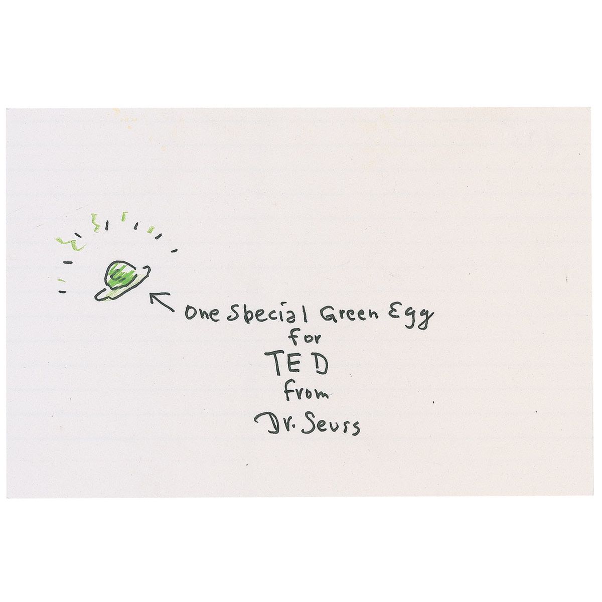 Original signed and inscribed sketch of a green egg on an off-white 6 x 4 sheet, signed and inscribed, “One special green egg for Ted from Dr. Seuss.” In fine condition.