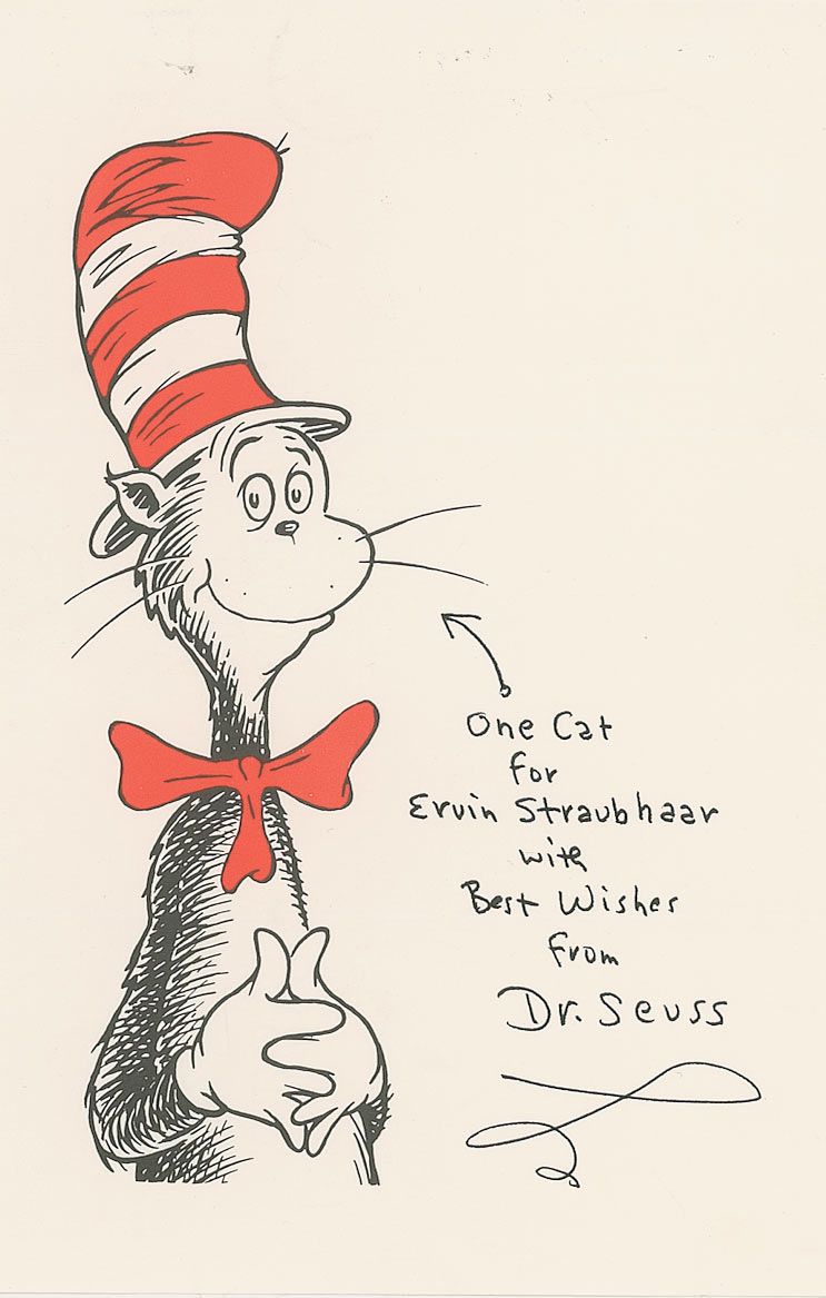Printed color illustration of the Cat in the Hat on an off-white 5.5 x 8.5 sheet, signed and inscribed, “One cat for Ervin Straubhaar with best wishes from Dr. Seuss.” In fine condition.
