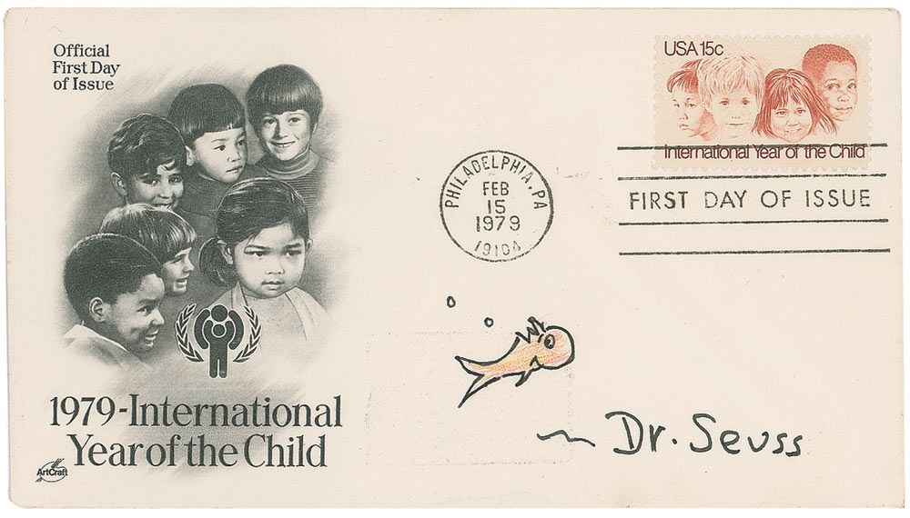 Original signed ink and colored pencil sketch of ‘one fish’ and bubbles on an off-white First Day Cover with a cachet honoring the International Year of the Child. In fine condition.