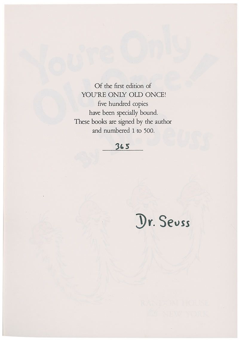 Signed book: You’re Only Old Once. Limited edition first edition of 500 copies (this being no. 365). NY: Random House, 1986. Hardcover with slipcase, 8.25 x 11.25. Signed on the limitations page in black felt tip. In fine condition, with a few trivial surface marks to covers and slipcase.