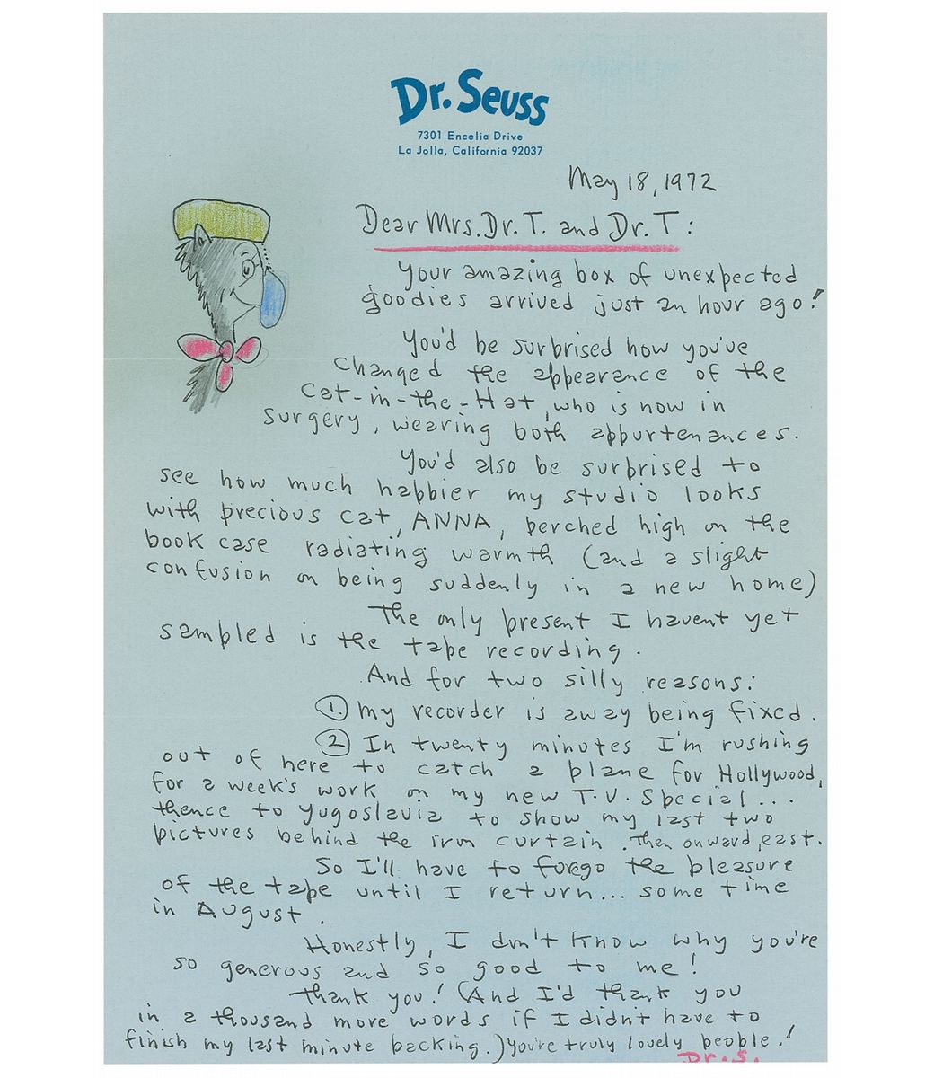 Featuring a one-of-kind sketch of Seuss’ beloved Cat in the Hat, tailored to recipients“Mrs. Dr. T. and Dr. T.,” the author’s first letter makes mention of him “rushing out of here to catch a plane for Hollywood, for a week’s work on my new T.V. Special.” His favorite cat had already premiered in his own animated television special, The Cat in the Hat, in March of 1971, and Seuss was jet-setting to LA to oversee the production of the follow-up, Dr. Seuss on the Loose, which aired on October 15, 1972. The show was hosted by The Cat in the Hat, featuring animated adaptations of other Seuss children’s stories, including The Sneetches, The Zax, and Green Eggs and Ham.