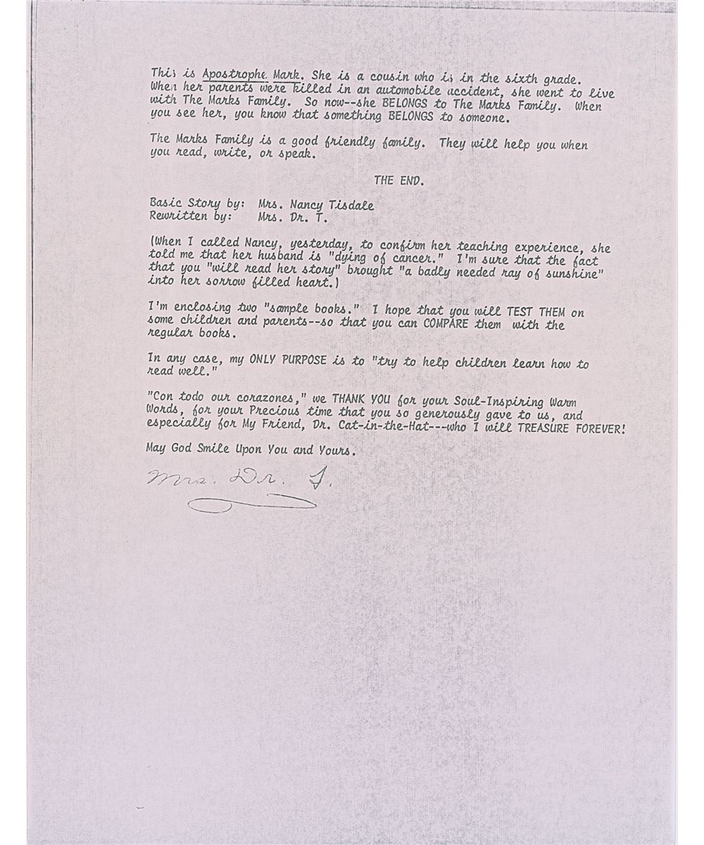 In fine condition, with signature a bit cramped due to space. The remaining two letters show a bit more wear, with toned front page to longer TLS, staple holes to both pages, and creasing through signature of last letter, as well as some scattered toning, otherwise fine condition. Each of Seuss’s letters are accompanied by their original mailing envelopes, and also accompanied by photocopies of the woman’s correspondence with Seuss, in which Mrs. Turllols praises the author’s work, calling his books “Unequaled and oustandingly successful because” they “motivate and captivate—not only the children—but also—the parents!” She also details “Instructions to Parents,” in which she spells out the phonetic process of reading, instructing, “Teach your child that just as ‘animals talk,’ for example, a cat says ‘Meow,’ so do the Alphabet letters talk.” The letters sing of the mission she shares with Seuss, which is to “try to help children learn how to read well.”