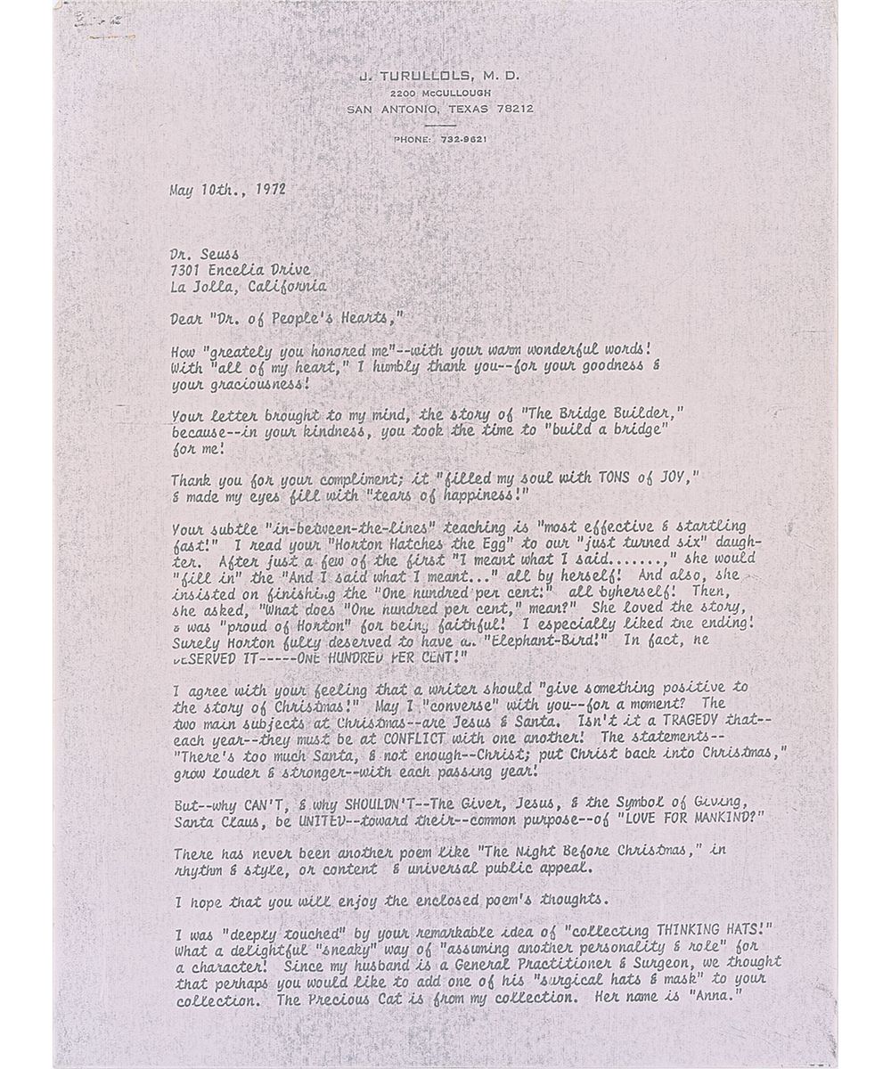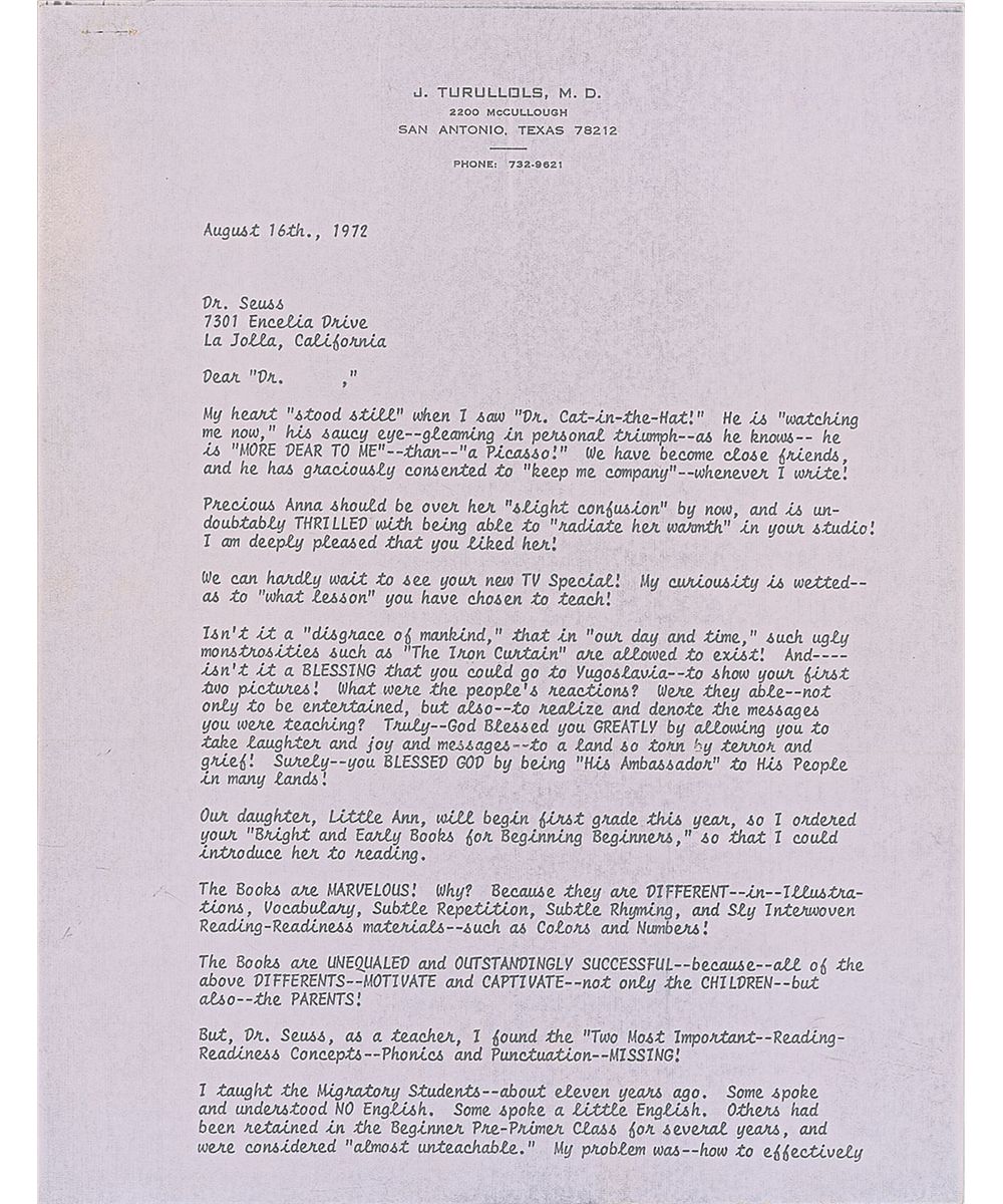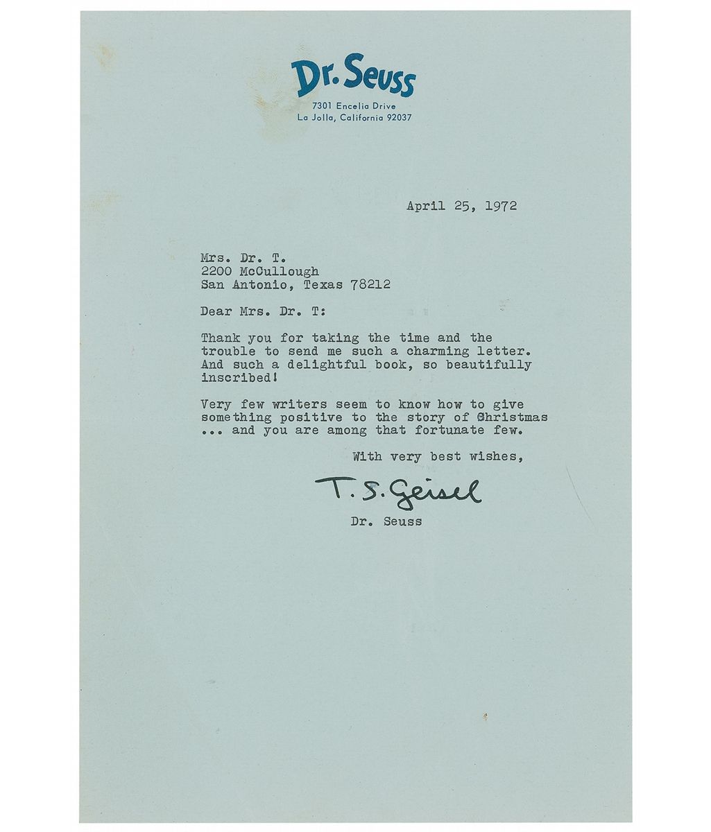 Three remarkable letters from Dr. Seuss, one ALS and two TLSs, all written to the wife of a Texas doctor during the spring and summer of 1972.