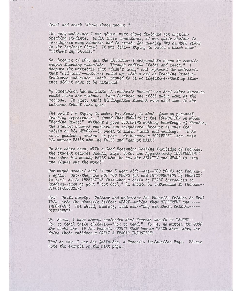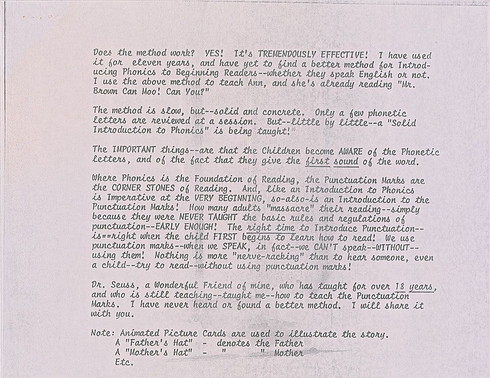 TLS, signed “Dr. Seuss,” two pages, 8.5 x 11, Beginner Books letterhead, dated August 28, 1972. Seuss responds to an inquiry about his stories being used more to teach. In part: “I agree with you entirely about the great importance of Phonics in teaching kids to read…And the inclusion of two ‘Instructions to Parents’ pages could also help any parent who is trying to teach his child to read and recognize punctuation marks. However, more than ten years ago, when Beginner Books was founded, the founders went through a long soul-searching period, during which we established our publishing philosophy. We discussed…Just how far should we get involved with actual teaching? And we finally came to the following conclusion: We should not involve ourselves with teaching at all. Rightly or wrongly, we decided not to teach, but rather to supplement the work of teachers. Since then, we feel that Beginner Books has served its purpose of giving kids books that kids want to read and will enjoy reading, after the basics of reading have been taught to them by others.”