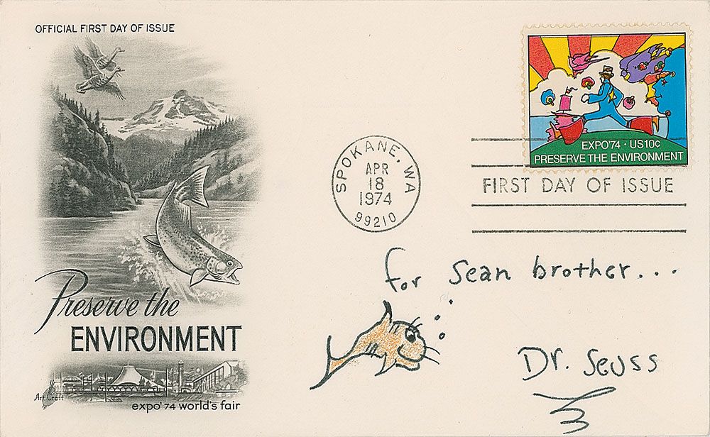 Original signed and inscribed ink and crayon sketch of a small orange fish on a 6.5 x 3.75 First Day Cover, signed and inscribed, “for Sean brother…Dr. Seuss.” In very fine condition.