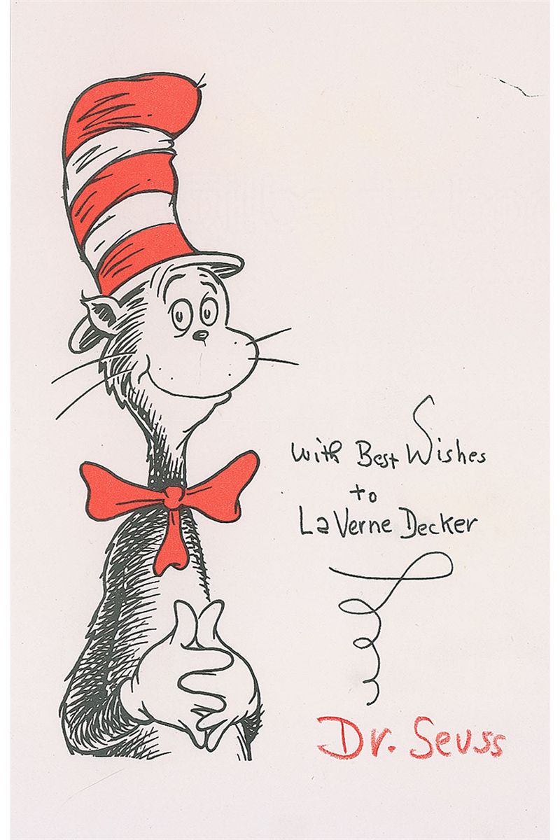 Printed sketch of Cat in the Hat on an off-white 5.5 x 8.5 sheet, inscribed in black felt tip, “With best wishes to LaVerne Decker,” and signed in red artist’s pencil, “Dr. Seuss.” In fine condition, with a horizontal mailing fold.