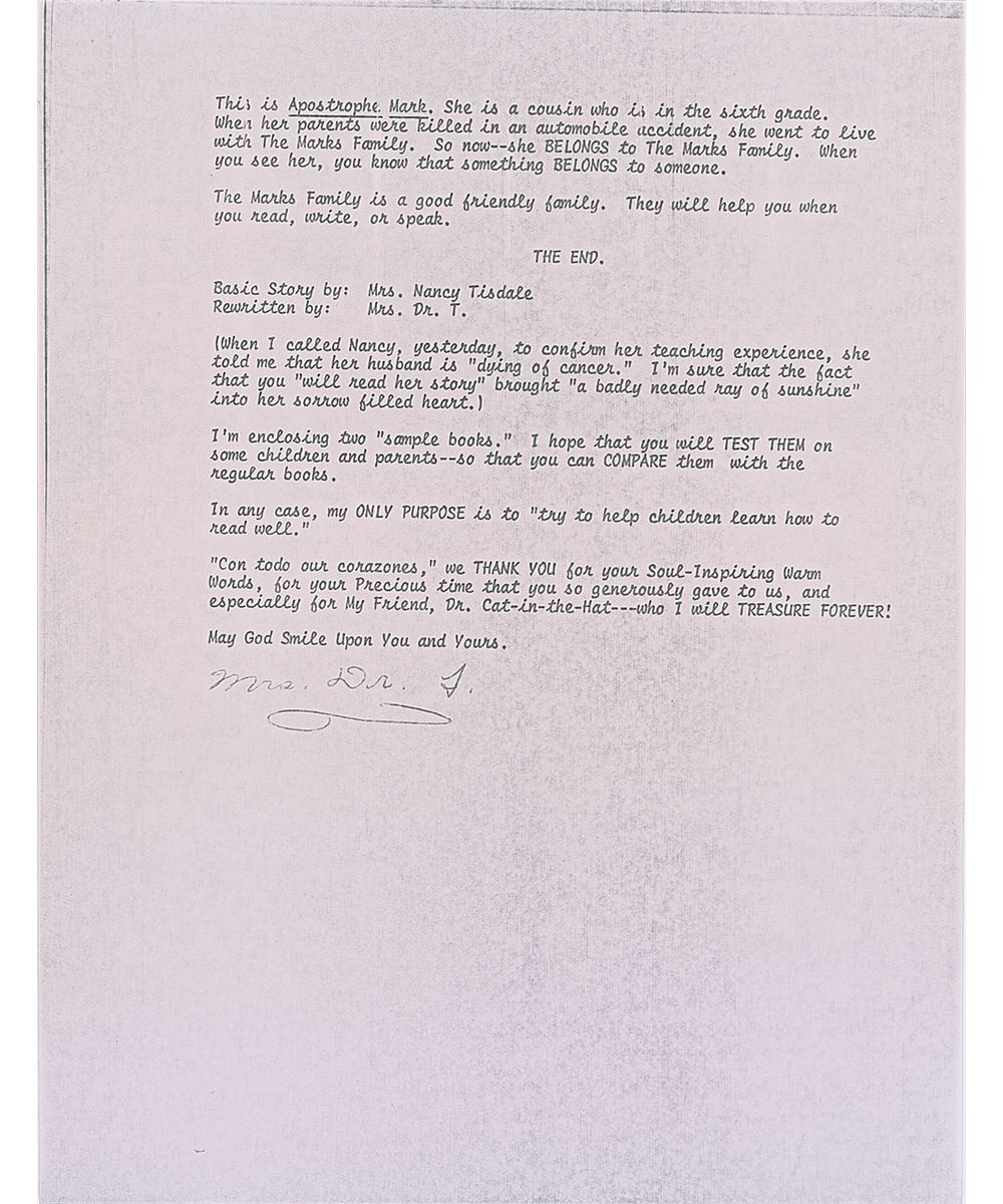 In fine condition, with signature a bit cramped due to space. The remaining two letters show a bit more wear, with toned front page to longer TLS, staple holes to both pages, and creasing through signature of last letter, as well as some scattered toning, otherwise fine condition. Each of Seuss’s letters are accompanied by their original mailing envelopes, and also accompanied by photocopies of the woman’s correspondence with Seuss, in which Mrs. Turllols praises the author’s work, calling his books “Unequaled and oustandingly successful because” they “motivate and captivate—not only the children—but also—the parents!” She also details “Instructions to Parents,” in which she spells out the phonetic process of reading, instructing, “Teach your child that just as ‘animals talk,’ for example, a cat says ‘Meow,’ so do the Alphabet letters talk.” The letters sing of the mission she shares with Seuss, which is to “try to help children learn how to read well.”