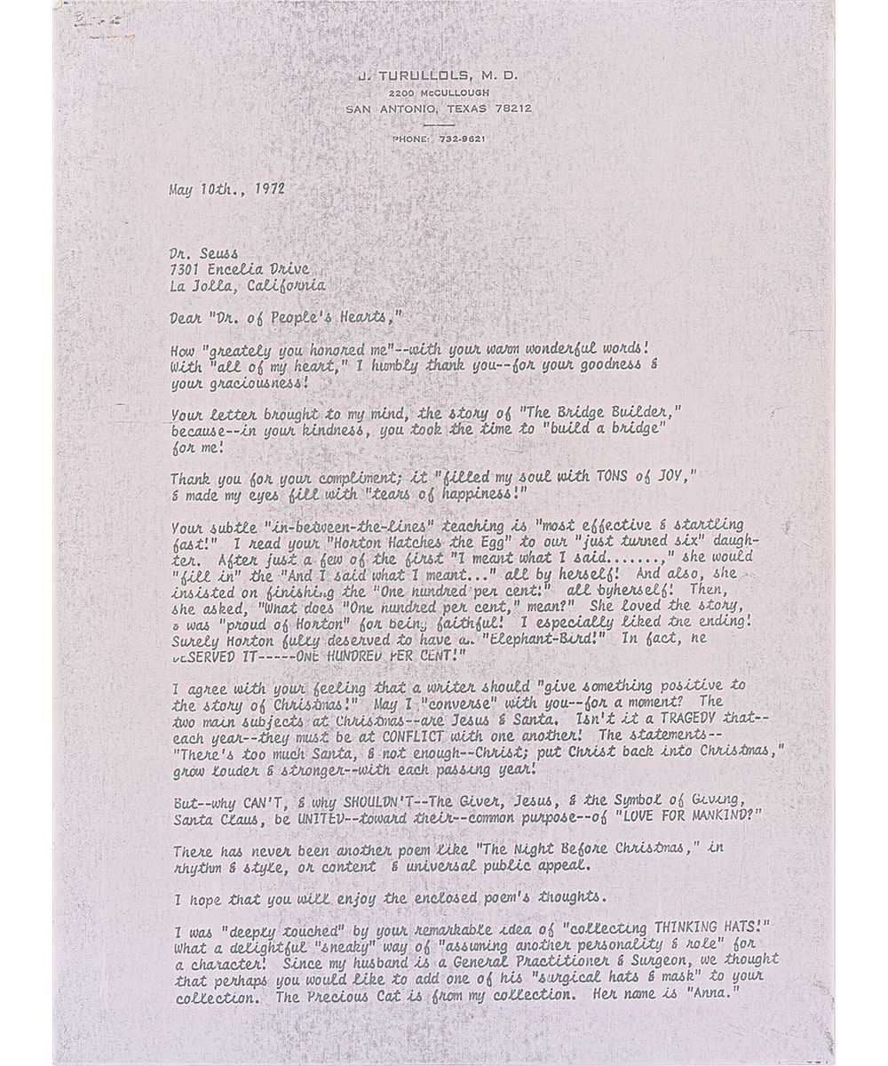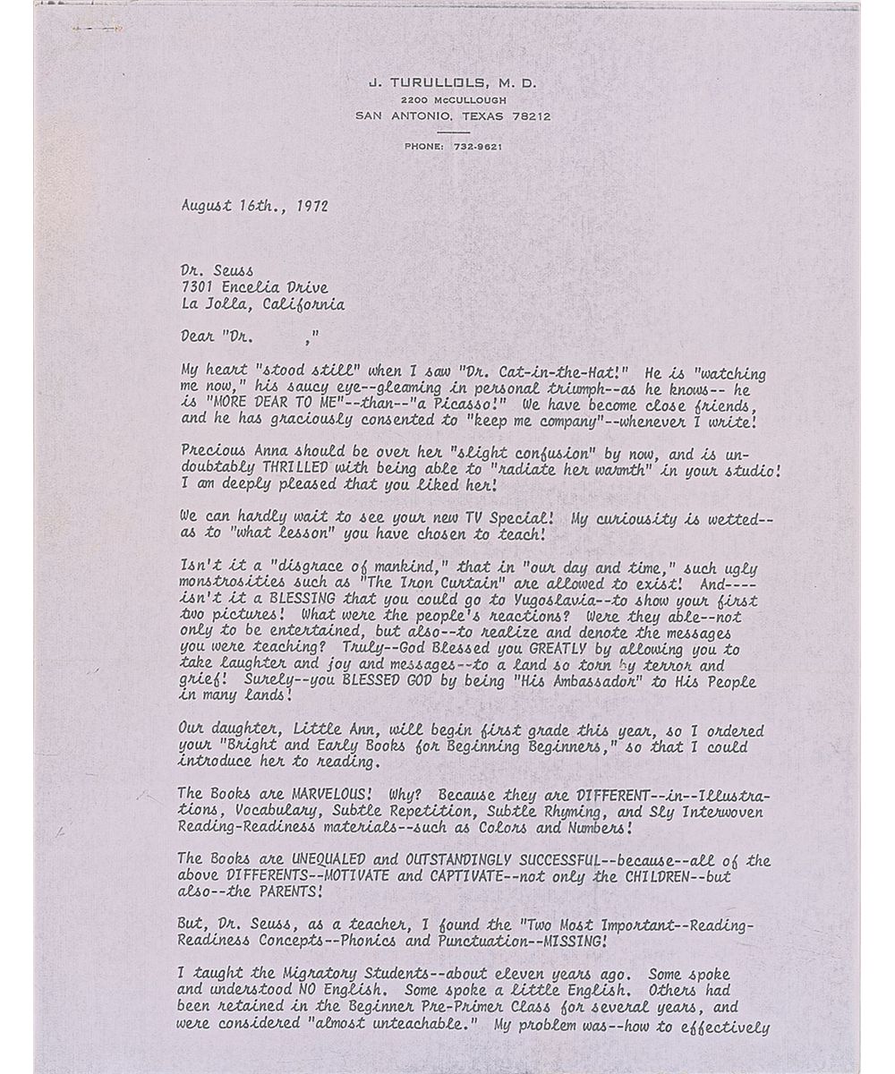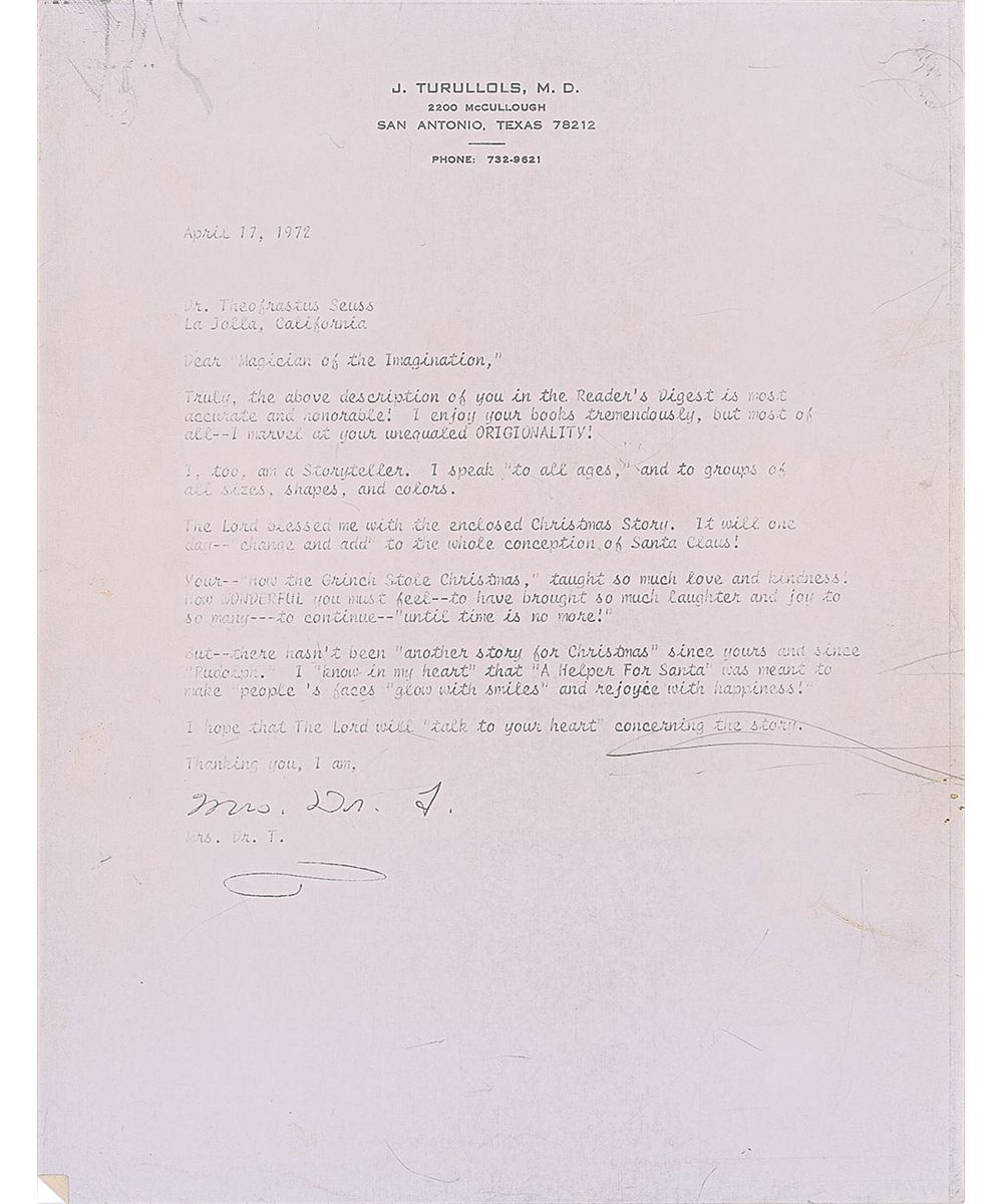 Three remarkable letters from Dr. Seuss, one ALS and two TLSs, all written to the wife of a Texas doctor during the spring and summer of 1972.