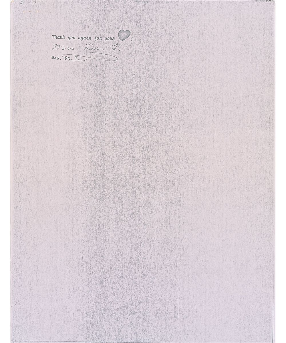 ALS, signed in red artist’s pencil, “Dr. S.,” one page, 7.25 x 10.5, Dr. Seuss letterhead, dated May 18, 1972. In the upper left of the page, Seuss has drawn a pencil, ink, and crayon sketch of the Cat in the Hat wearing a surgical mask and cap. Seuss writes, in full: “Your amazing box of unexpected goodies arrived just an hour ago! You’d be surprised how you’ve changed the appearance of the cat-in-the-hat, who is now in surgery, wearing both appurtenances. You’d also be surprised to see how much happier my studio looks with precious cat, Anna, perched high on the book case radiating warmth (and a slight confusion on being suddenly in a new home). The only present I haven’t yet sampled is the tape recording. And for two silly reasons: