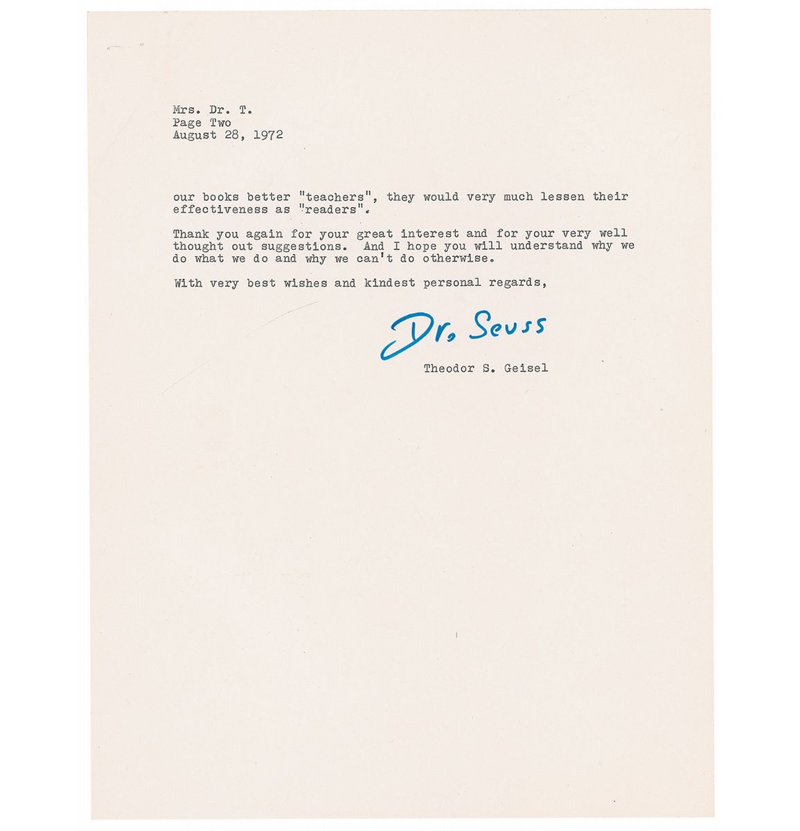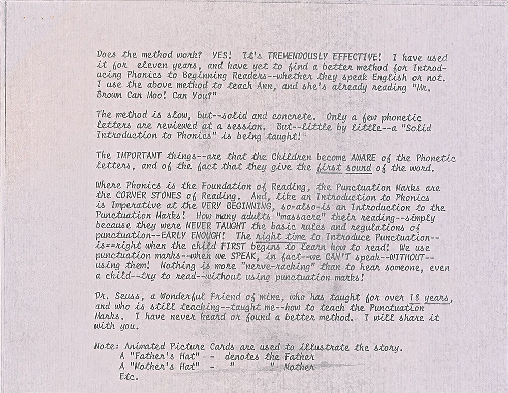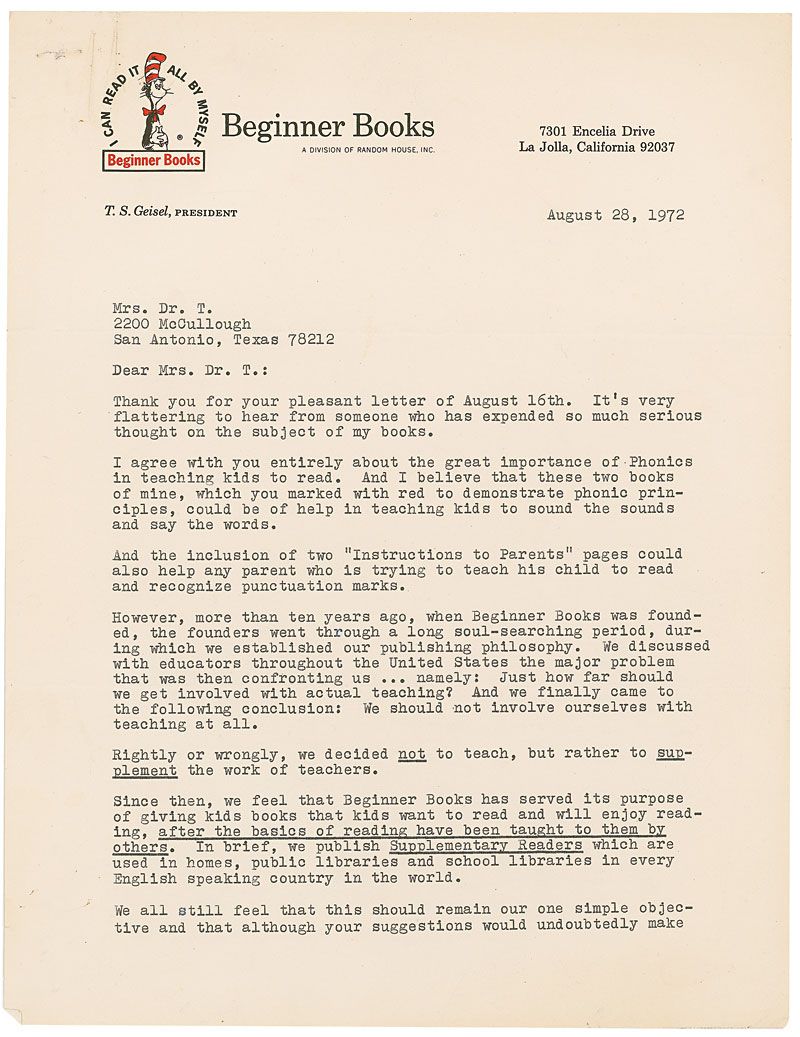 TLS, signed “Dr. Seuss,” two pages, 8.5 x 11, Beginner Books letterhead, dated August 28, 1972. Seuss responds to an inquiry about his stories being used more to teach. In part: “I agree with you entirely about the great importance of Phonics in teaching kids to read…And the inclusion of two ‘Instructions to Parents’ pages could also help any parent who is trying to teach his child to read and recognize punctuation marks. However, more than ten years ago, when Beginner Books was founded, the founders went through a long soul-searching period, during which we established our publishing philosophy. We discussed…Just how far should we get involved with actual teaching? And we finally came to the following conclusion: We should not involve ourselves with teaching at all. Rightly or wrongly, we decided not to teach, but rather to supplement the work of teachers. Since then, we feel that Beginner Books has served its purpose of giving kids books that kids want to read and will enjoy reading, after the basics of reading have been taught to them by others.”
