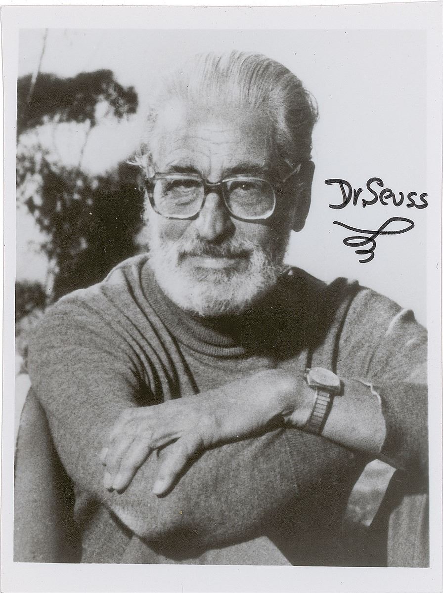 Glossy 3.5 x 4.75 photo of Dr. Seuss, signed in black felt tip. In fine condition.