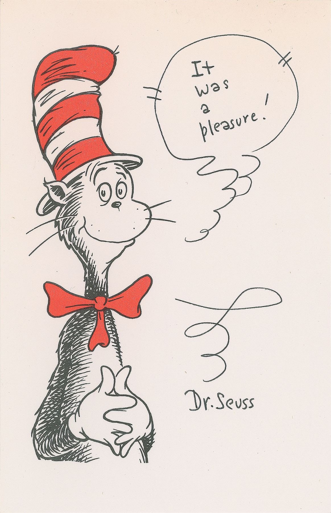 Ink signature, "Dr. Seuss,” on an off-white 5.5 x 8.5 sheet bearing a printed image of the Cat in the Hat. Seuss adds a speech bubble to the upper right and writes, "It was a pleasure!" In fine condition, with a very light central vertical mailing fold.