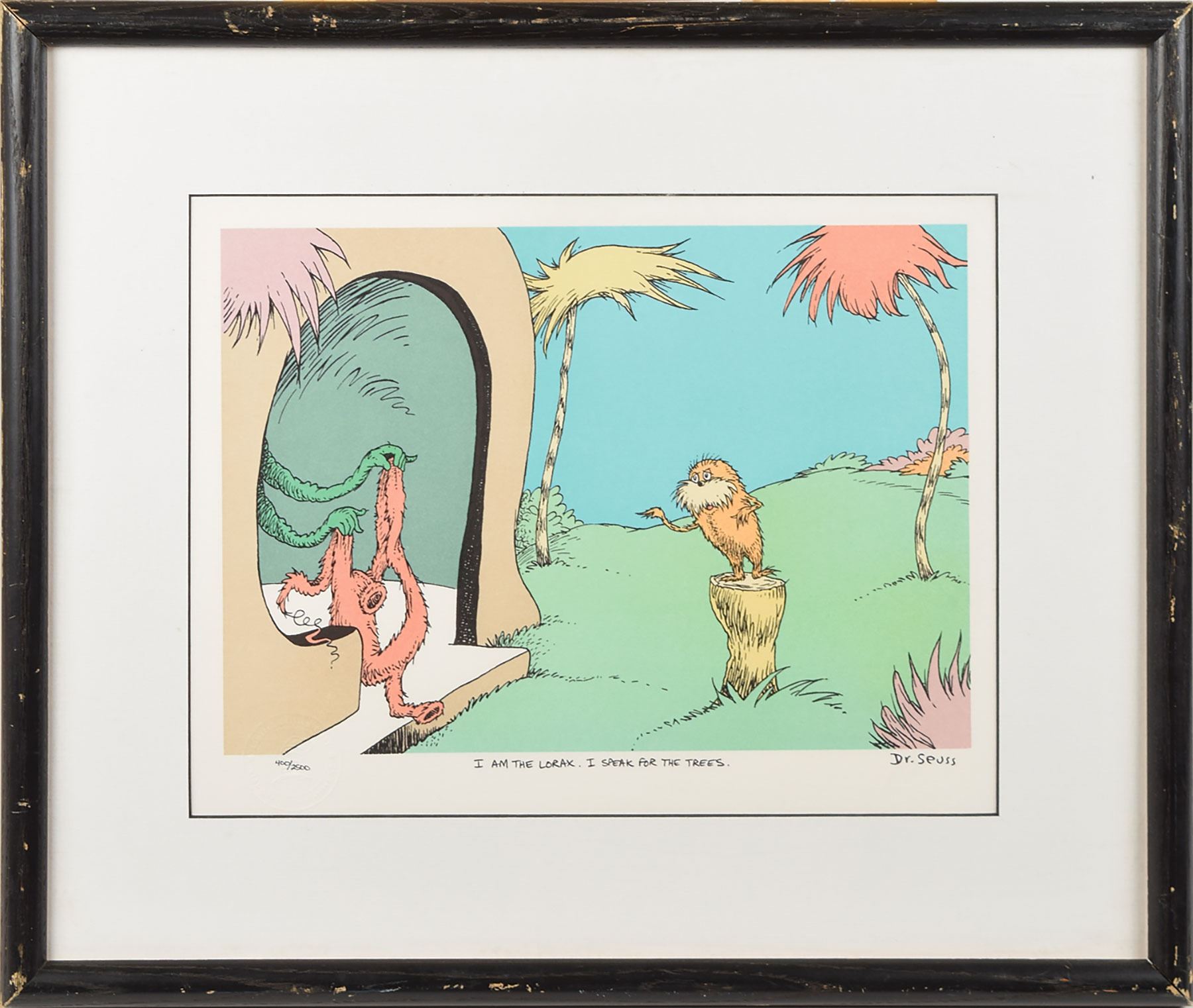 Limited edition color 13 x 10 hand-pulled lithograph of a drawing from Dr. Seuss' classic 1971 children's book The Lorax, entitled "I am the Lorax. I speak for the trees," depicting the moment when the Lorax confronts the Once-ler about chopping down trees in the Truffula Tree Forest, numbered 400/2500. Lower border bears a printed signature of Dr. Seuss, as well as the Lorax's proclamation: "I am the Lorax. I speak for the trees." Lower left corner bears a Dr. Seuss Enterprises blindstamp. Matted and framed to an overall size of 19.25 x 16.25. In very fine condition. Accompanied by a certificate of authenticity from Dr. Seuss Enterprises/The Chase Group.