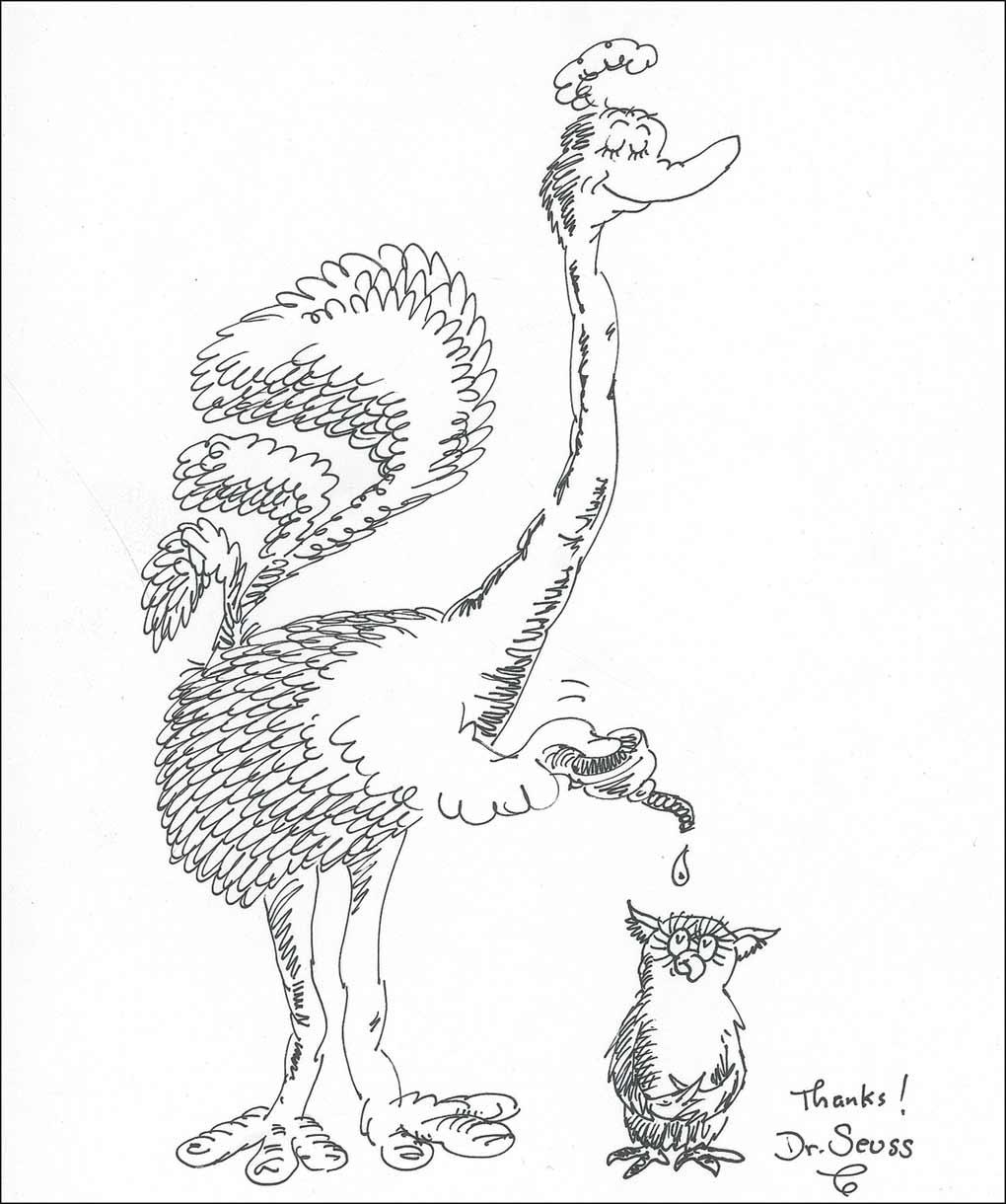 Original signed ink sketch of an ostrich oiling an owl on an off-white 8 x 9.5 sheet, signed at the bottom, “Thanks! Dr. Seuss.” In very fine condition.