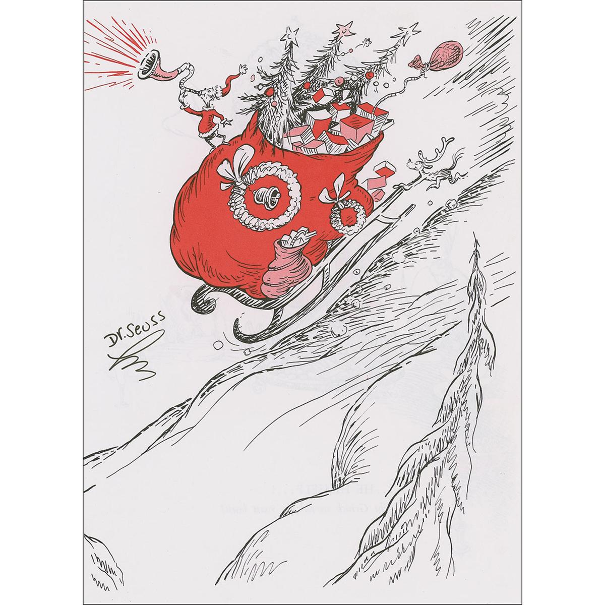 Book page, 8 x 11, removed from a copy of How the Grinch Stole Christmas, signed in black felt tip, “Dr. Seuss.” In fine condition, with trimmed left edge.