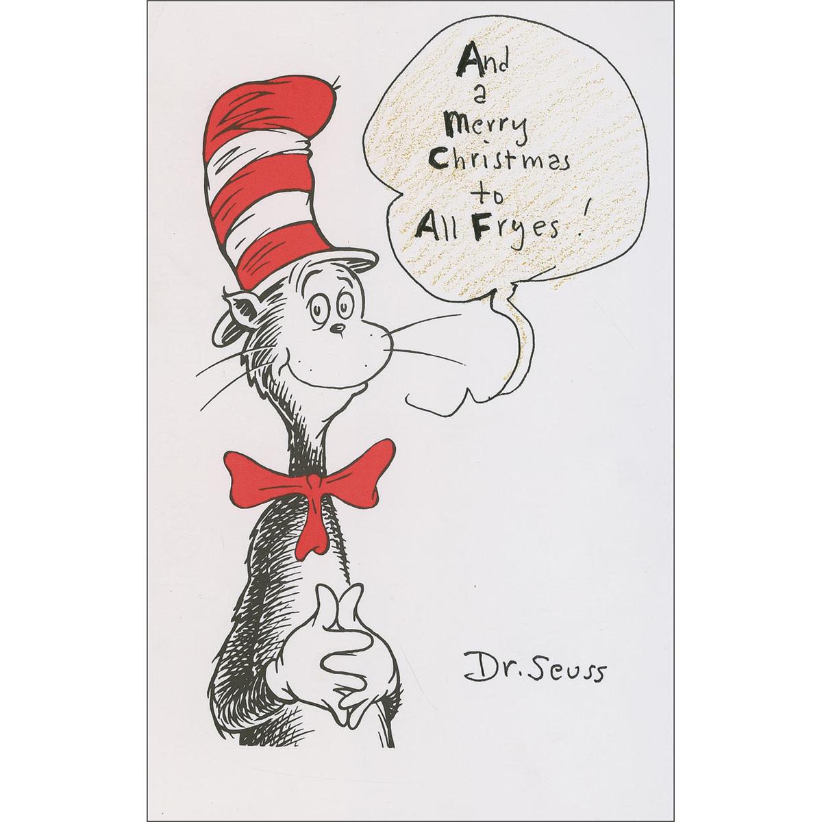 Printed signed and inscribed ink sketch of the Cat in the Hat on an off-white 5.5 x 8.5 sheet, with a speech bubble coming from the Cat reading “And a Merry Christmas to All Fryes!,” and signed at the bottom, “Dr. Seuss.” In very fine condition.