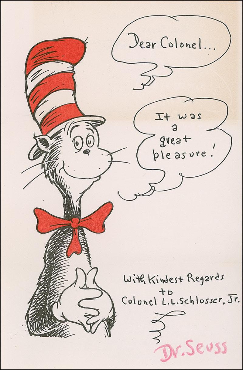Printed signed and inscribed sketch of Cat in the Hat on an off-white 5.5 x 8.5 sheet, with two speech bubbles coming from the Cat reading “Dear Colonel… It was a great pleasure!” Signed at the bottom, “Dr. Seuss.” In fine condition, with irregular block of toning at the top of the page.