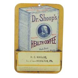 Dr. Shoop's Health Coffee litho on tin match holder-Newton-Hamilton, PA adv., Ex. condition, 5"H.