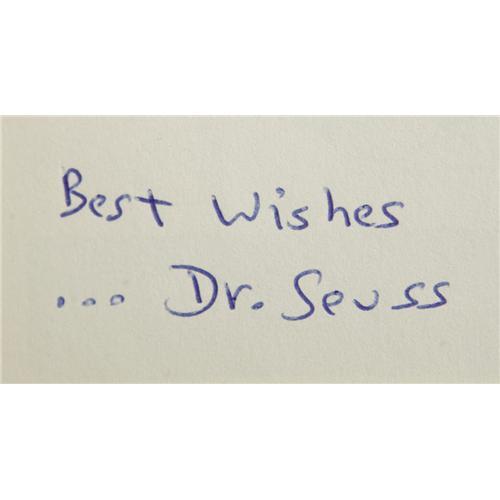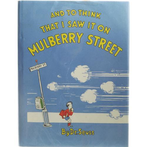 <B>Dr. Seuss Signed:<I> And To Think That I Saw It On Mulberry Street.</B></I></B></I> (New York: Vanguard Press, 1937), 13th printing, unpaginated, illustrated by the author, signed by author "<I>Best Wishes…Dr. Seuss</B></I>", on the recto of the ffep, pictorial boards, 4to (8.25" x 11"), yellowed remnants of cellophane tape on front and rear boards, also on dust jacket flaps, else very good in a very good jacket. This was Seuss' first children's book.<BR><BR><b>Shipping:</b> Books & Catalogs (<a target="_blank" href="http://www.heritageauctions.com/common/shipping.php">view shipping information</a>)