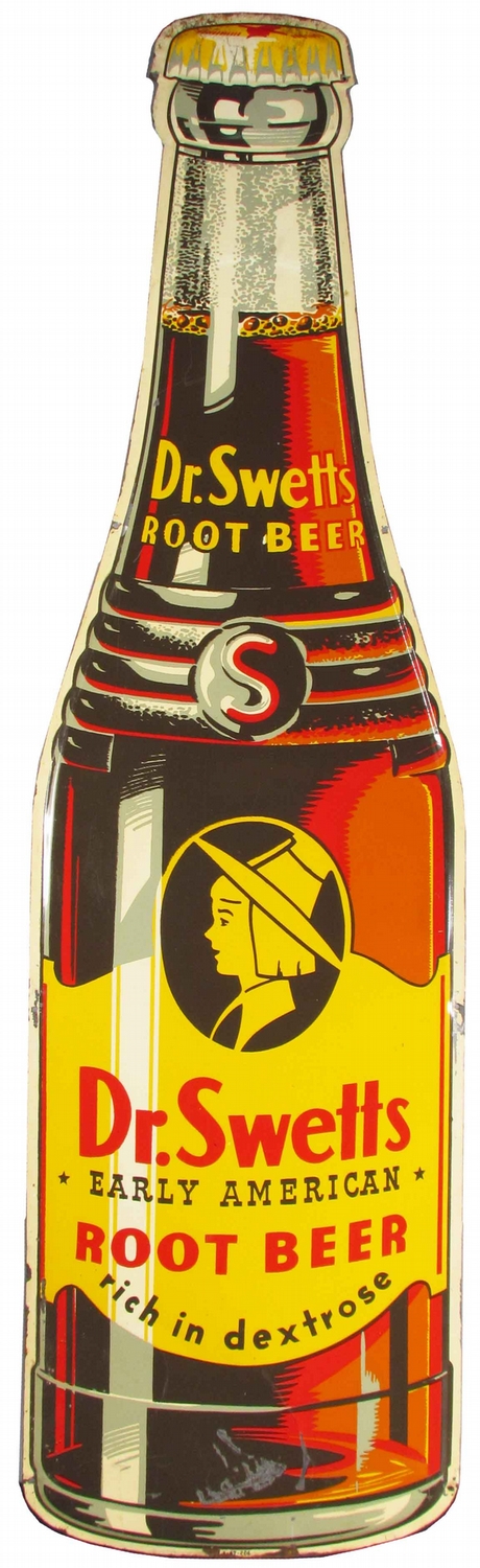 Dr. Swetts Root Beer Die Cut Tin Sign. Scratch at 6:00 and some minor edge ware otherwise good condition. 42 X 12 1/4 inches.