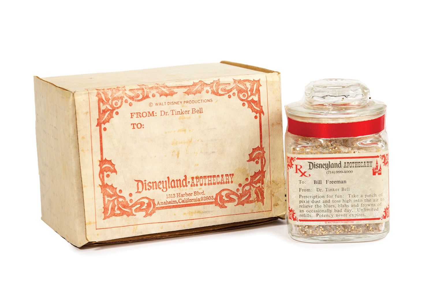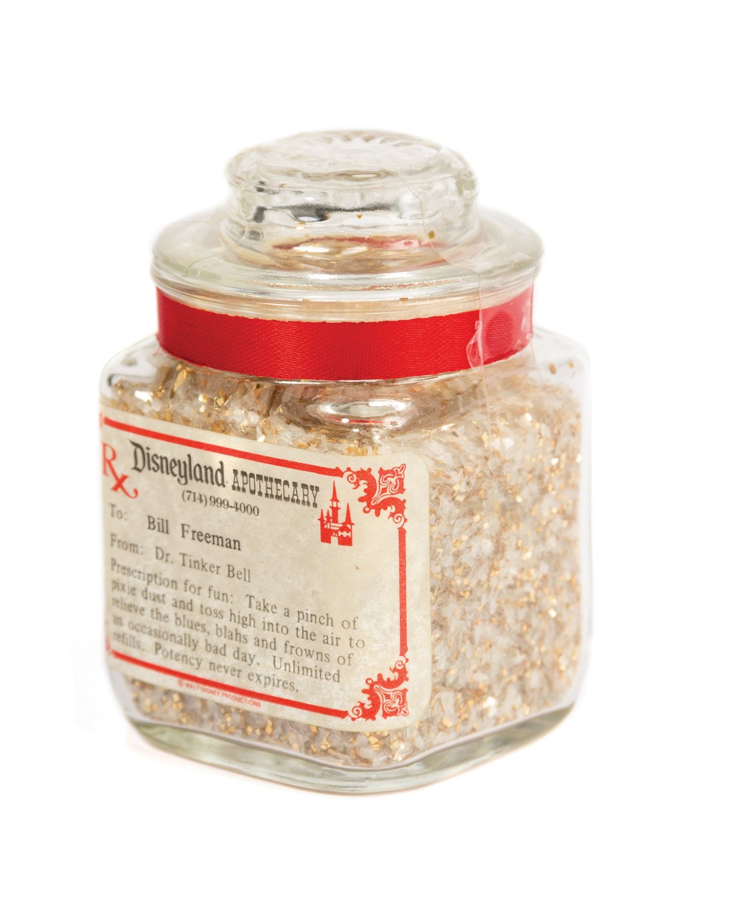 (Disneyland, c.1958) During the early years of the park, guests could have a “prescription” filled by Dr. Tinker Bell for her special “pixie dust" at the Main Street Apothecary. The bottle's label could be personalized, as this one has been with the name "Bill Freeman." Measuring 3.25" tall, the glass bottle is in very good condition with minor wear to the label. The original pixie dust is still contained within the bottle, and the original box is included.