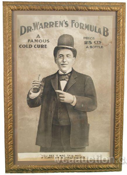 Dr. Warren's Formula B Litho. Sign, "A Famous Cold Cure" "You See It Was This Way, It Cured Me In Three Hours" in frame - 26" x 37"