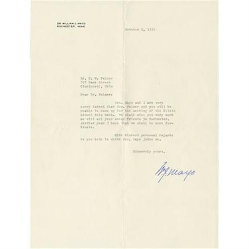 <B>Dr. William Mayo Typed Letter Signed</B></I> “<I>W. J. Mayo</B></I>”. One page, 7.75” x 10.25”, on his personal letterhead, October 16, 1931, to Dr. Dudley W. Palmer, Cincinnati, Ohio. Dr. Mayo expresses sorrow that Dr. and Mrs. Palmer have canceled a planned visit. With the usual fold creases, a small spit in the crease of a fold at the top margin, else fine. <BR><BR><b>Shipping:</b> Flat Material, Small (<a target="_blank" href="http://www.heritageauctions.com/common/shipping.php">view shipping information</a>)