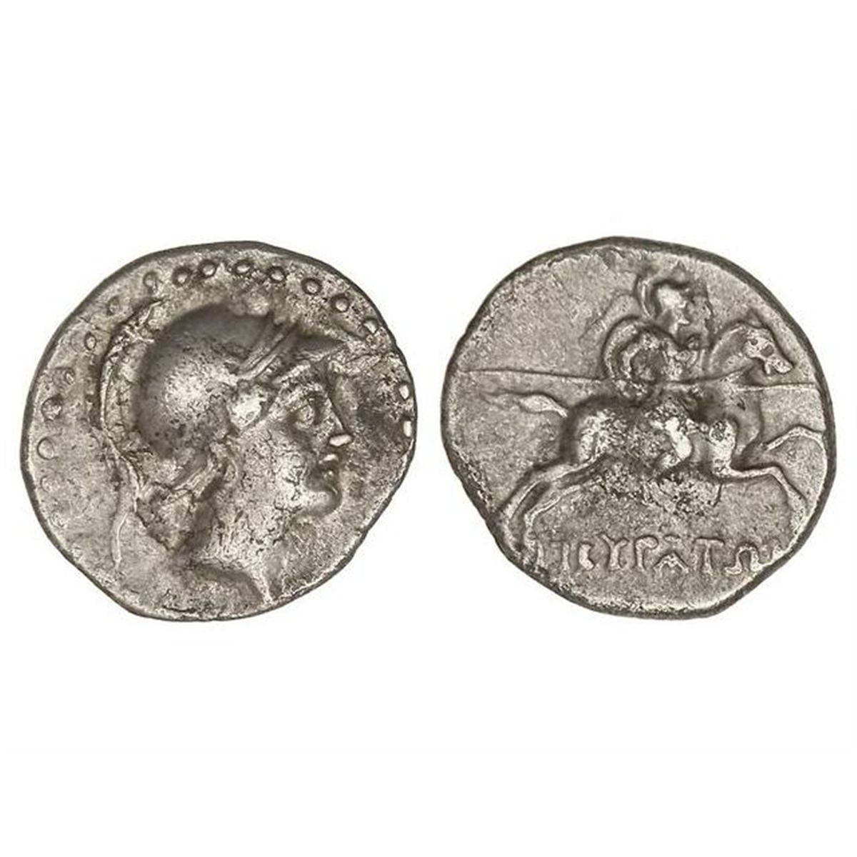 Dracma. - 166-84 a.C. - KIBYRA. - PHRYGIA. - Anv.: Cabeza con casco a derecha. Rev.: Jinete con lanza a galope a derecha. 3,44 grs. AR. (Oxidaciones). Se-5127 Sim. MBC/MBC-. - -