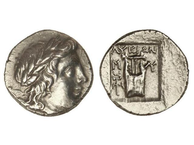 Dracma. 168 a.C. MASIKYTES. LYCIA. Anv.: Cabeza laureada de Apolo a derecha. Rev.: Lira en cuadro incuso, alrededor leyenda. 3 grs. AR. Se-5291 var. EBC.