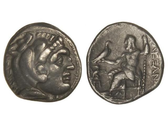 Dracma. 336-323 a.C. ALEJANDRO MAGNO. ABDERA. TRACIA. Anv.: Cabeza de Hércules con piel de león a derecha. Rev.: Zeus entronizado a izquierda, delante grifo y símbolo. 4 grs. AR. Müller-290. MBC+/MBC.