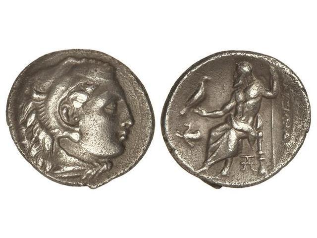 Dracma. 336-323 a.C. ALEJANDRO MAGNO. URBES INCIERTAS DE MACEDONIA, TRACIA y TESALIA. Anv.: Cabeza de Hércules con piel de león a derecha. Rev.: Zeus entronizado a izquierda, detrás leyenda, delante símbolos. 4,20 grs. AR. (Lev