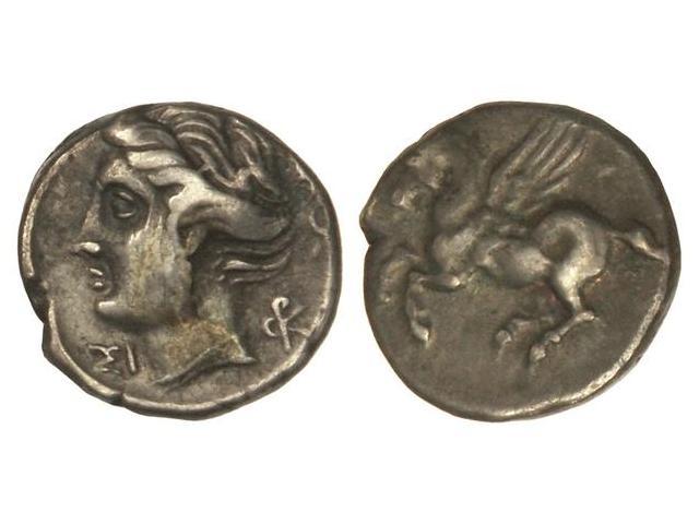 Dracma. - 400-350 a.C. - CORINTO. - Anv.: Pegaso a izquierda. Rev.: Cabeza de Afrodita a izquierda. 2,50 grs. AR. Se-2634 var. (MBC+). - -