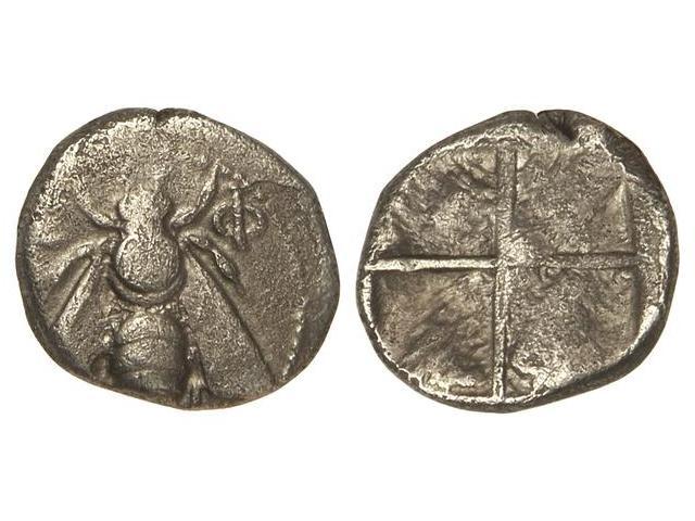 Dracma. 480-450 a.C. EFESOS. Anv.: Abeja. Rev.: Cuadro incuso dividido en cuatro partes. 3,10 grs. AR. Se-4366. MBC-.
