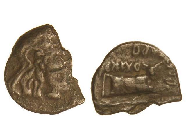 Dracma. ARSE-ARSBIGISTEEGIAR. Anv.: Cabeza galeada a derecha. Rev.: Toro androcéfalo a derecha. 2,40 grs. AR. Cortada por la mitad para circular como 1/2 dracma. MUY RARA. AB-2040. BC+.