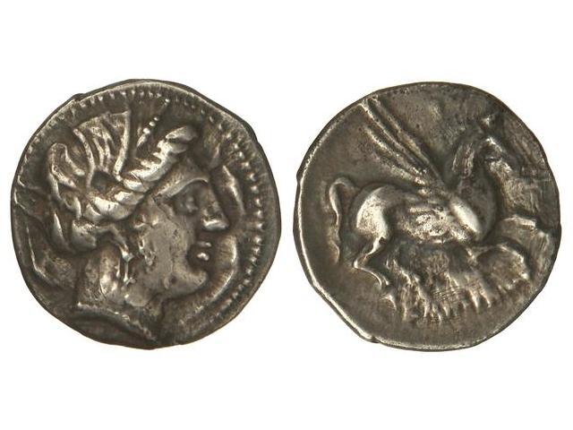 Dracma. - EMPORITON. - Anv.: Cabeza de Perséfone a derecha, rodeada por tres delfines. Rev.: Pegaso a derecha con la cabeza modificada, debajo leyenda griega EMPORITON. 4,70 grs. AR. (Hoja en anverso, rayitas en reverso). AB-1108 sim. (MBC+). - -