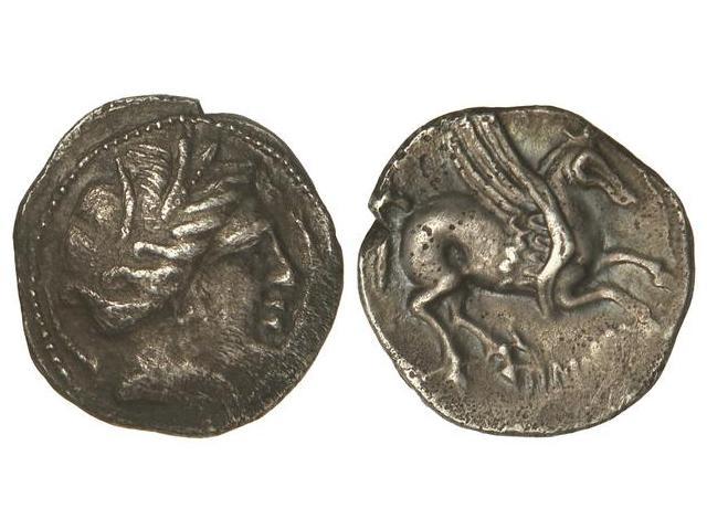 Dracma. - EMPORITON. - Anv.: Cabeza de Perséfone a derecha, rodeada por tres delfines. Rev.: Pegaso a derecha con la cabeza modificada, debajo leyenda griega EM(PORITON). 4,60 grs. AR. AB-1108 sim.; Vill-43. MBC. - -