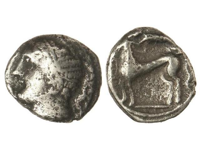 Dracma. EMPORITON. IMITACIÓN EMPORITANA. Anv.: Cabeza de Perséfone a izquierda de estilo tosco. Rev.: Caballo parado a izquierda, encima Victoria. 4,43 grs. Ligera pátina. (Oxidaciones). Vill-6 sim. var. MBC-.