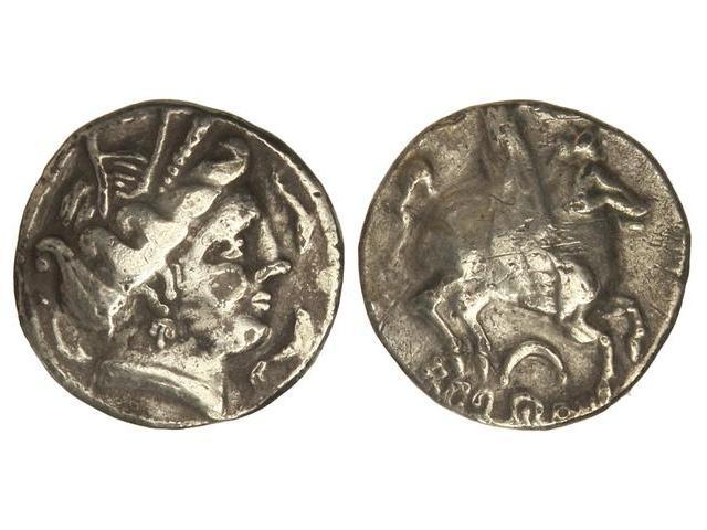 Dracma. - IMITACIONES IBÉRICAS. - EMPORION. - Anv.: Cabeza de Perséfone a derecha entre delfines. Rev.: Pegaso a derecha con cabeza modificada, debajo torques sobre leyenda ibérica de difícil interpretación. 4,37 grs. AR. (Limpiada). RARA. AB-1138 sim.; Vill-60. (MBC+). - -