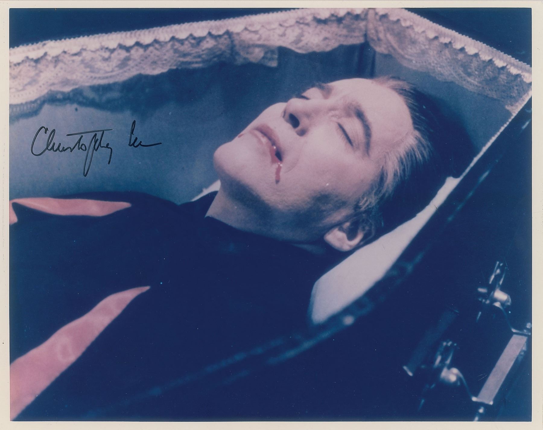 Color glossy 10 x 8 photo of Christopher Lee as Count Dracula lying in his coffin, signed in black felt tip. In fine condition.