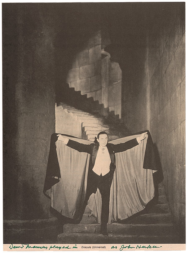 Actor (1900–1998) best known as the hero John Harker opposite Bela Lugosi in the 1931 film Dracula. Eerie 7.75 x 10.25 book photo of Lugosi’s Dracula descending a staircase, signed in the lower border in green ink, “David Manners played in [Dracula] as John Harker.” In fine condition.