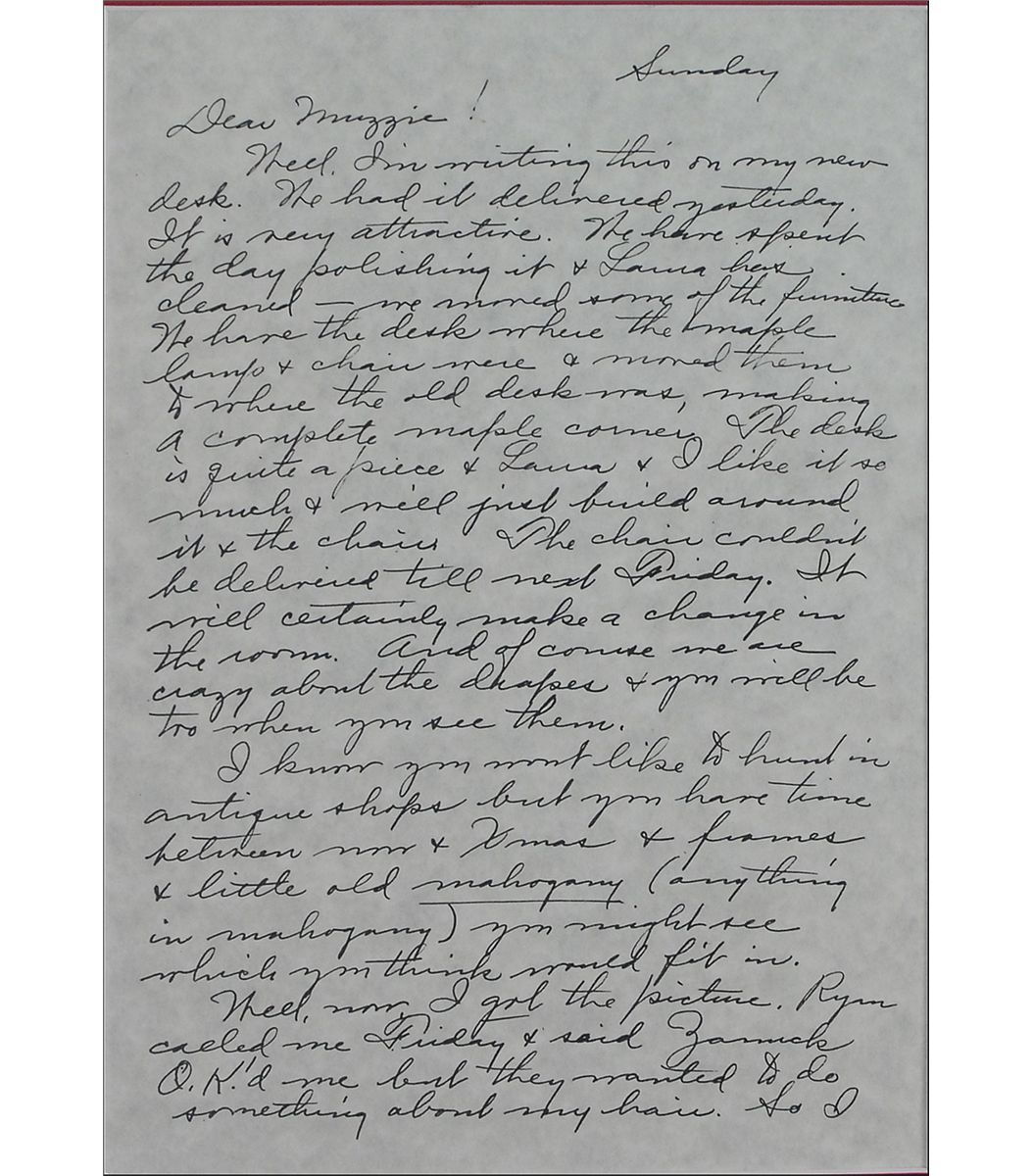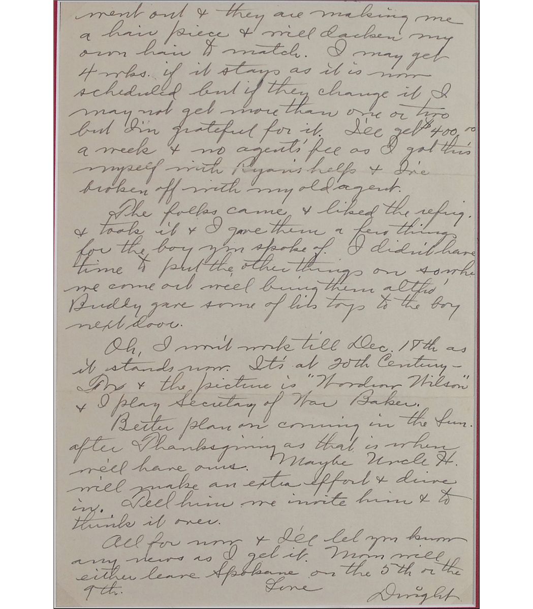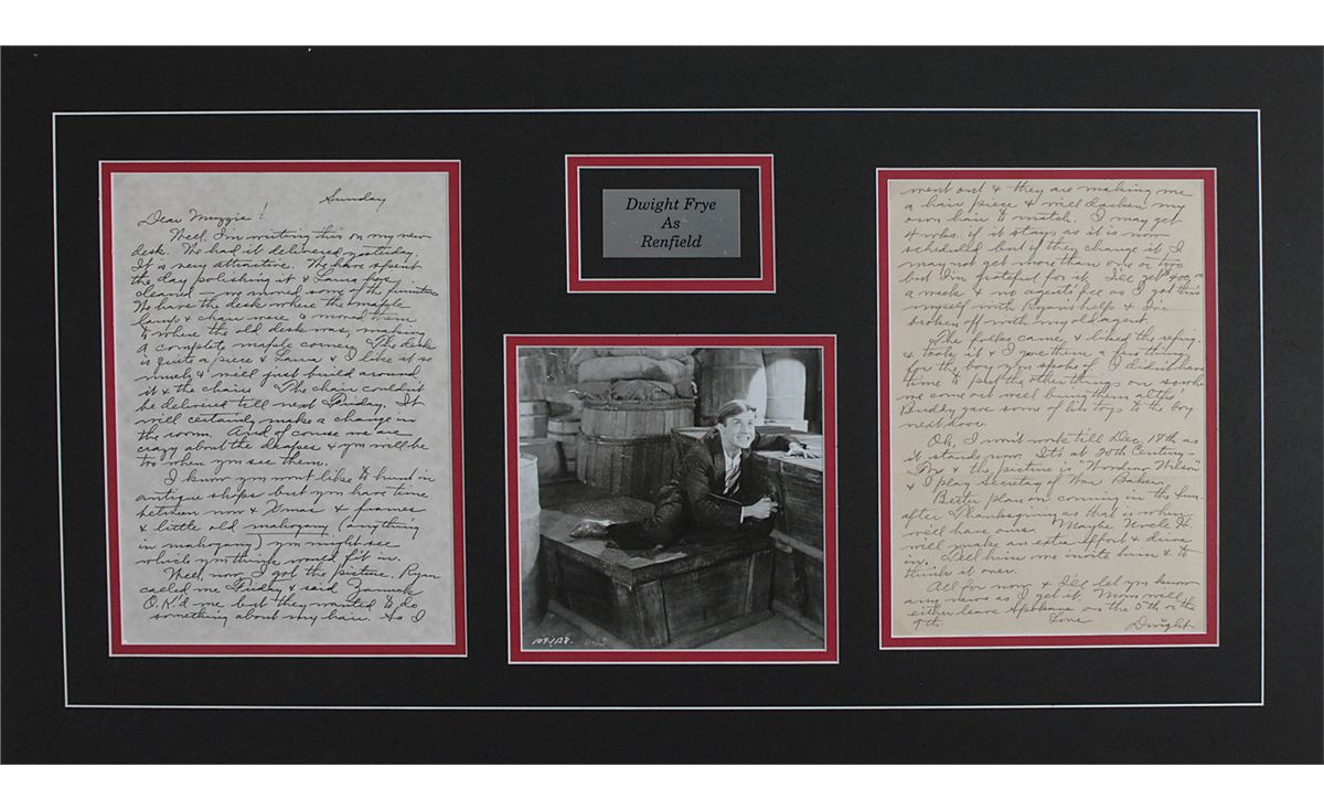 Character actor (1899–1943) who played the lunatic Renfield opposite Bela Lugosi in Dracula, as well as Colin Clive’s assistant Fritz in Frankenstein. Incredibly rare ALS signed “Dwight,” one page both sides, 7 x 10, no date, but circa late 1943. Letter to his mother, referring to her as “Muzzie.” In part: “Well, now, I got the picture. Ryan called me Friday & said Zanuck O.K.’d me but they wanted to do something about my hair. So I went out & they are making me a hair piece & will darken my own hair to match. I may get 4 wks if it stays as it is now scheduled but if they change I may not get more than one or two but I’m grateful for it. I’ll get $400.00 a week & no agent’s fee as I got this myself with Ryan’s help & I’ve broken off with my old agent…Oh, I won’t work till Dec. 18th as it stands now. It’s at 20th Century Fox & the picture is ‘Woodrow Wilson’ & I play Secretary of War Baker.” Double-matted with a copy of the front of the letter, a photo of Frye from Dracula and a small plaque, to an overall size of 30 x 17. In fine condition. Unfortunately, Frye died of a heart attack on November 7, 1943, just days before filming of Zanuck’s Wilson was scheduled to begin. A superb example of one of the rarest and most desirable horror film autographs. Oversized.