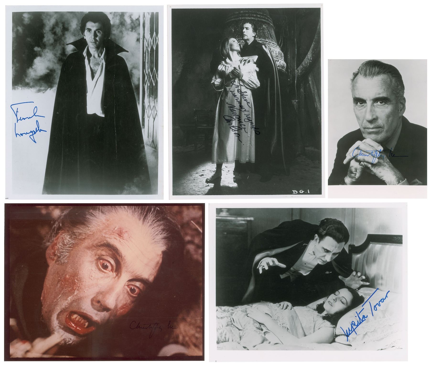 Five glossy photos signed in felt tip by actors and actresses from Dracula films, ranging in size from 5 x 7 to 10 x 8, including: Christopher Lee (2), Frank Langella, Veronica Carlson (ins), and Lupita Tovar. In overall very good to fine condition, with scattered light creasing, and a vertical scratch, to the Langella photo.