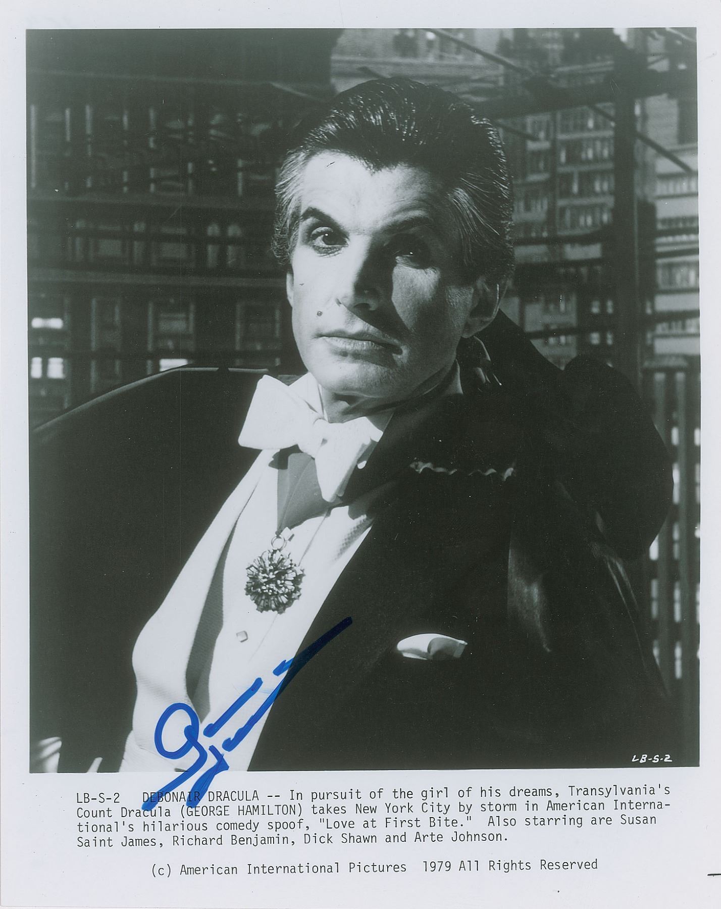 Glossy 8 x 10 photo of Hamilton as Count Dracula in the 1979 comedy horror film Love at First Bite, signed in blue felt tip. In fine condition, with light surface impressions at the top from a small notation on the back.