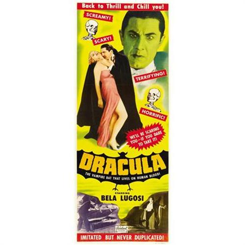 <B>Dracula (Realart, R-1951).</B></I> Insert (14" X 36"). One of the premiere films of the Golden Age of Universal Horror, "Dracula" introduced the movie-going public to Hungarian-born Bela Ferenc Dezso Blasko, better known as Bela Lugosi. His suave European charm and exotic accent thrilled audiences in 1931, and continues to do so to this day, making "Dracula" one of the cornerstones of twentieth century cinema. The movie was re-released into theaters in 1951, with supporting posters by Realart, such as the insert offered here. Garish and eye-catching, Realart posters have become prized by collectors for their outstanding graphics. This particular copy displays the expected horizontal fold lines and corner pinholes, but neither of these slight defects are enough to distract from the overwhelming eye appeal of this great piece. Very Fine+ on Paper.<BR><BR><b>Shipping:</b> Flat Material, Large (<a target="_blank" href="http://www.heritageauctions.com/common/shipping.php">view shipping information</a>)