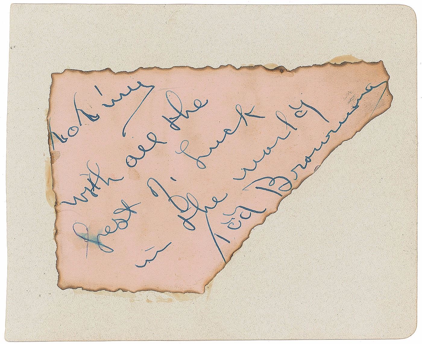 Director, actor, and screenwriter (1880–1962) best known as the director of Dracula in 1931 and the cult classic Freaks in 1932. Rare vintage fountain pen signature and inscription, "To Tiny, with all the best of luck in the world, Tod Browning,” on an off-white 4.5 x 3 slip. In very good condition, with irregularly trimmed and adhered to a larger album page with toning from adhesive to borders. Consignor notes that the recipient of the autograph is purported to have been Tiny Earles, a member of the famed Dolly Family performers. Although uncredited, Tiny was cast alongside her siblings Harry and Daisy in Browning's classic 1932 film Freaks. Browning remains terrifically scarce across all formats.