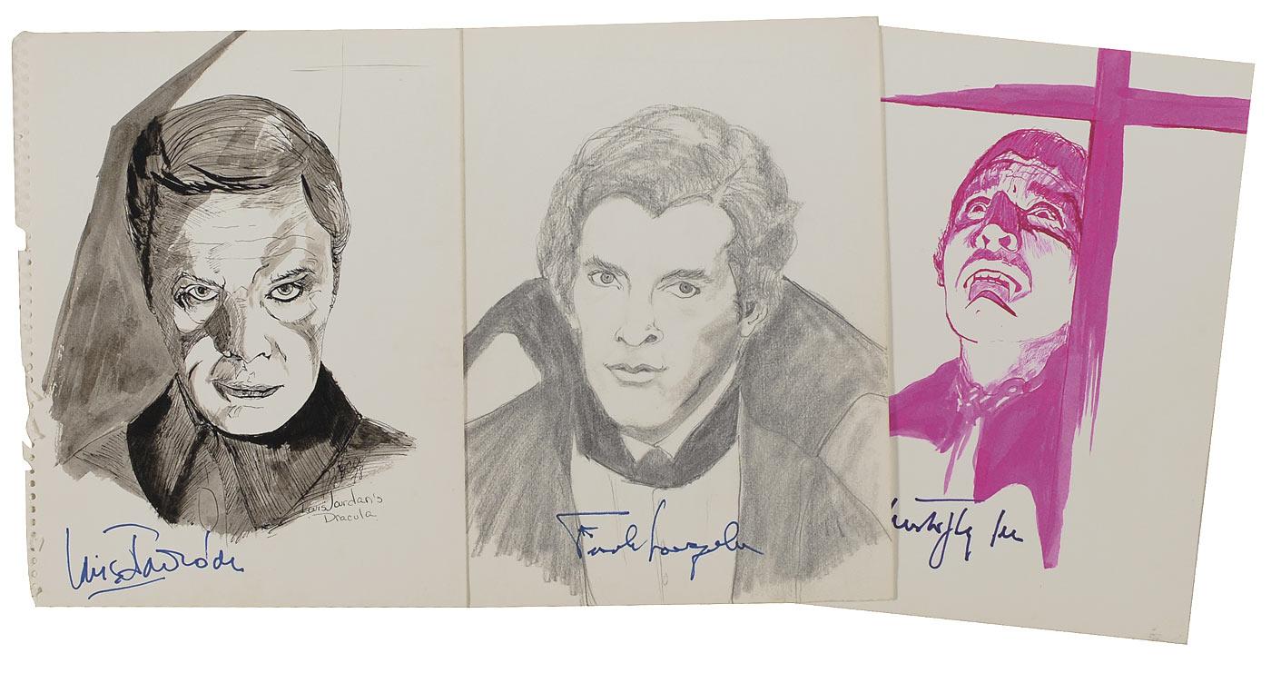 Three original ink sketches of Dracula actors, all approximately 8.5 x 11, all done in a collector’s hand, each signed in felt tip by the respective actor pictured. Signers are: Christopher Lee, Frank Langella, and Louis Jourdan. In fine condition.