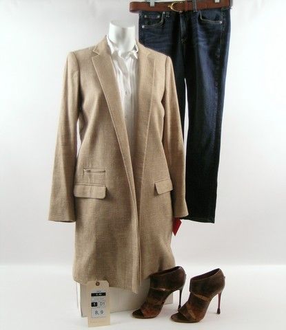 Ali (Jennifer Garner) screen worn, hero, straw woven three quarter length three pocket fully lined 'Massimo Dutti' coat, white long sleeve button front blouse, brown leather with spur buckle 'Gucci' belt, (size 36) medium blue denim 'Rag & Bone' jeans, (size 29) and rust/brown mottled reptile three wide straps with open toe 'Christian Louboutin' heels. (size 39, 4" heel) Includes wardrobe tag!