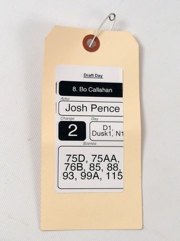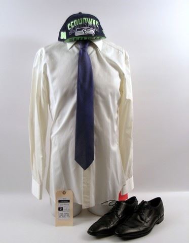 Bo Callahan (Josh Pence) screen worn, hero, cream cotton long sleeve button front 'Anto' custom made dress shirt, blue and silver micro check 'Zegna' neck tie, Seattle Seahawks 'New Era' cap, (size 7 1/8) and black leather square toe 'Hugo Boss' shoes. (size 12) Includes wardrobe tag!