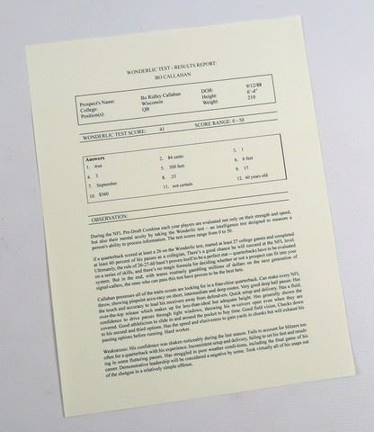 Bo Callahan (Josh Pence) screen used, Wonderlic test and score. (approx. 8 1/2" x 11")