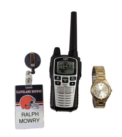 Ralph Mowry's screen worn, hero, Brown's ID card, working walkie talkie, and faux gold stretch watch.
